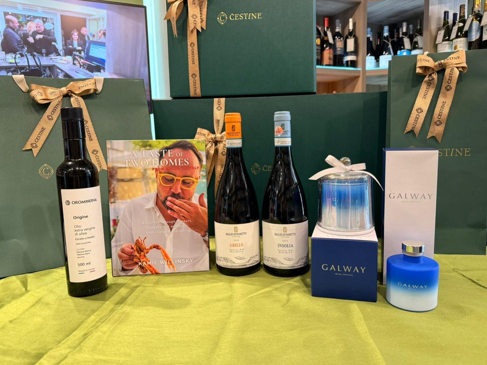 Fresh wines, olive oil, and aromatic candles capture the essence of the sea for a calm and indulgent holiday gift. Includes: BDP Insolia DOC (75cl), BDP Grillo DOC (75cl), A Taste of Two Homes, Orominerva Origine Olio Extra Vergine (500ml), Galway Diffuser Fresh Atlantic, Galway Candle Fresh Atlantic, Large Premium Gift Box, Packaging & Ribbon.