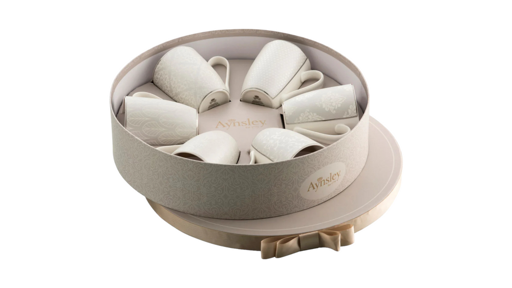Elevate your tea service with this distinguished set of six Aynsley Silver Brocade mugs, presented in an elegant hat box. Each piece features the brand's signature silver brocade pattern—a refined botanical design that brings timeless sophistication to any table setting. Crafted from fine porcelain with a smooth glaze finish, these mugs combine durability with understated luxury. Perfect for daily use or special occasions, the coordinated set ensures consistency across your tableware. The presentation box makes this an ideal gift for collectors and those who appreciate quality ceramics.