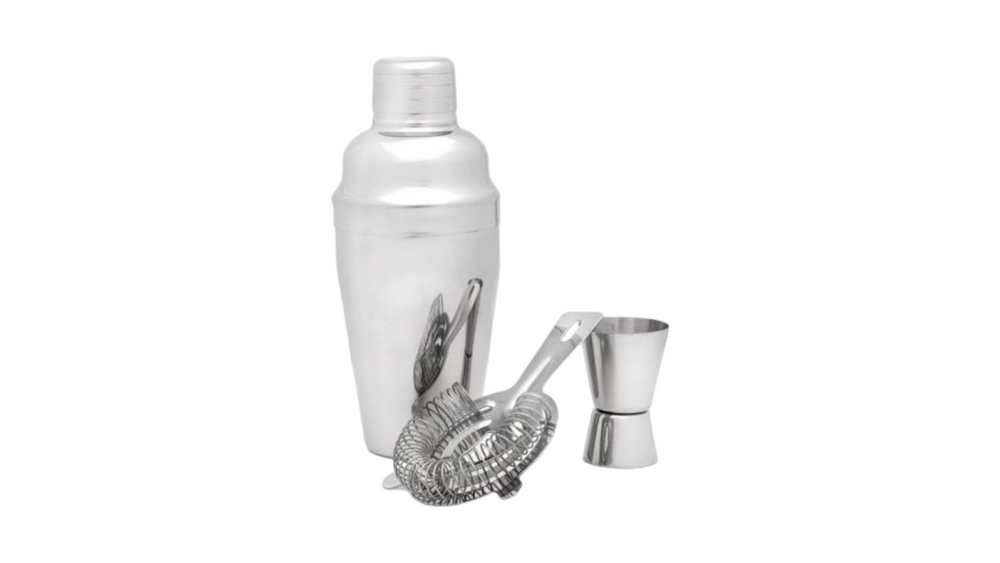 The bar set consists of a cocktail shaker, cocktail filter, and measuring glass.