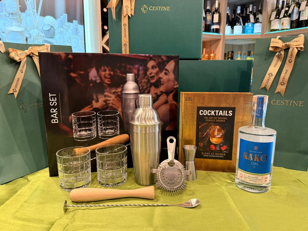 Malta’s own gin with bar set and cocktail guide for a creative, fun, and stylish festive gift. Includes: KAKO Maltas Own Gin (70cl), Bar Set 7 Pieces Leopold Vienna, Book Cocktails The Art Of Mixing Perfect Drinks, Large Premium Gift Box, Packaging & Ribbon.