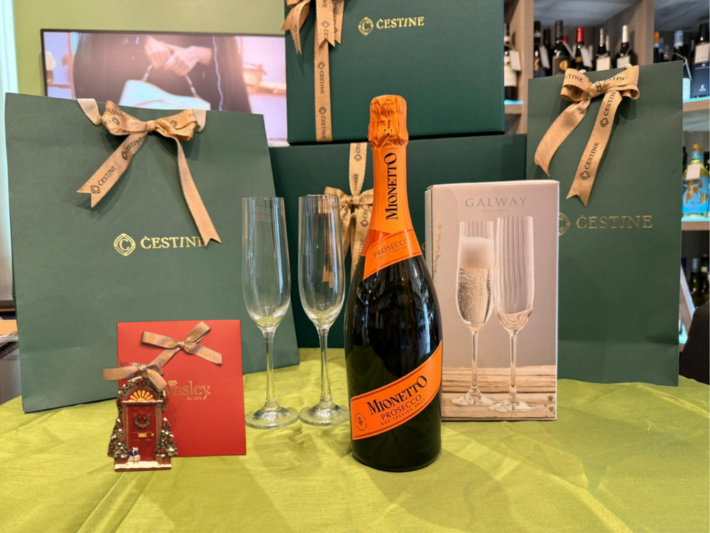 Sparkling prosecco with crystal flutes and festive ornamentation, perfect for elegant holiday cheer. Includes: Mionetto Prosecco DOC Treviso, Galway Crystal Erne Champagne Flute Pair, Aynsley Christmas Small Front Door Ornament, Small Premium Gift Box, Packaging & Ribbon.