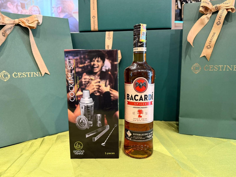 Spiced rum with cocktail set invites festive fun, laughter, and the creation of joyful holiday memories. Includes: Bacardi Spiced Rum (70cl), Cocktail Set Abouriou, Small Premium Gift Box, Packaging & Ribbon.