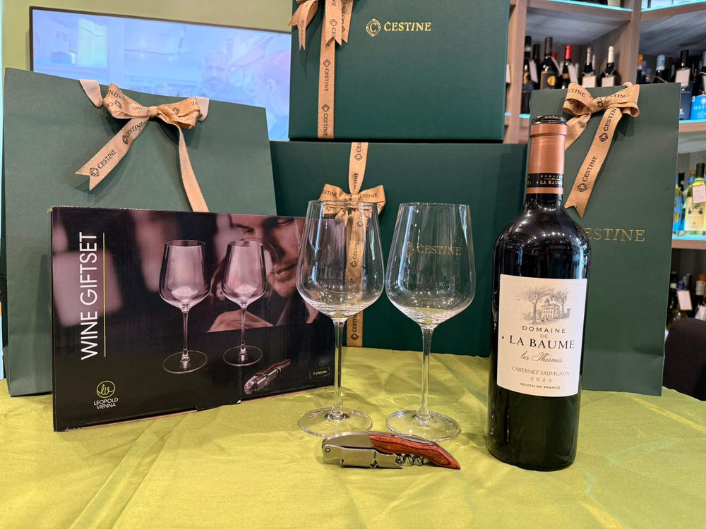 Elegant Cabernet Sauvignon paired with a curated wine gift set, ideal for refined holiday indulgence. Includes: Domaine De La Baume Cabernet Sauvignon (75cl), Wine Giftset 3 Pieces, Small Premium Gift Box, Packaging & Ribbon.