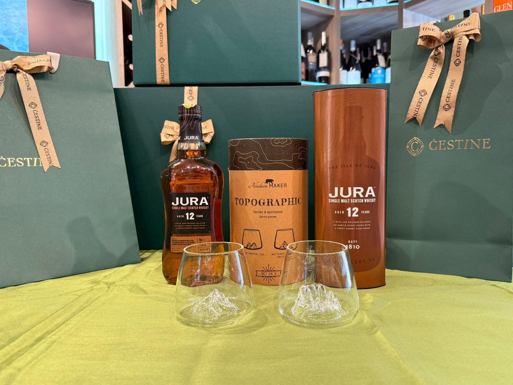 12-year-old whisky with fine Alaskan glasses, a luxurious gift for creating memorable holiday moments. Includes: Jura 12YO (70cl), Alaskan Glasses Grand Canyon & Matter Set of 2, Small Premium Gift Box, Packaging & Ribbon.