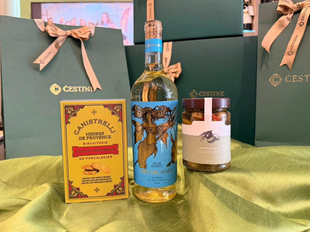 A Mediterranean-inspired hamper with artisanal cheeses and marinated olives, evoking calm and indulgence. Includes: Oro del Mare Pecorino IGT, Canistrelli Herbs de Provence, Ogygia Marinated Olive Mix (314g), Small Premium Gift Box, Packaging & Ribbon.