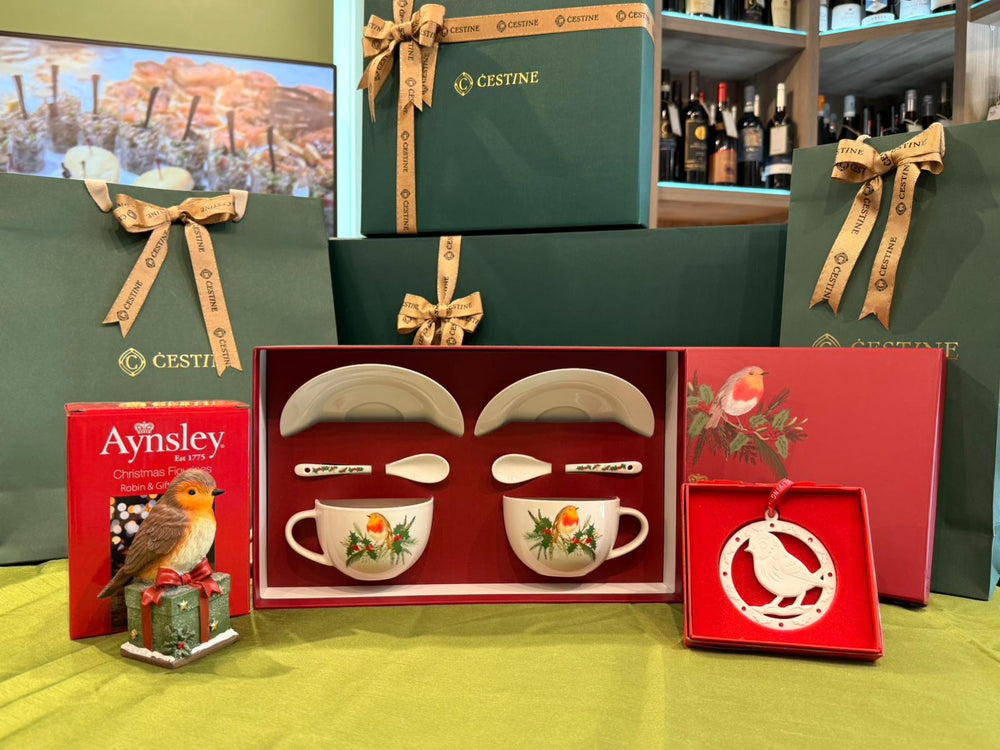 Festive figurines and cappuccino set combine for a whimsical and elegant holiday gift. Includes: Belleek Robin Ornament, Aynsley Robin & Gift Figurine, Aynsley Robin Cappuccino Set of 2, Large Premium Gift Box, Packaging & Ribbon.
